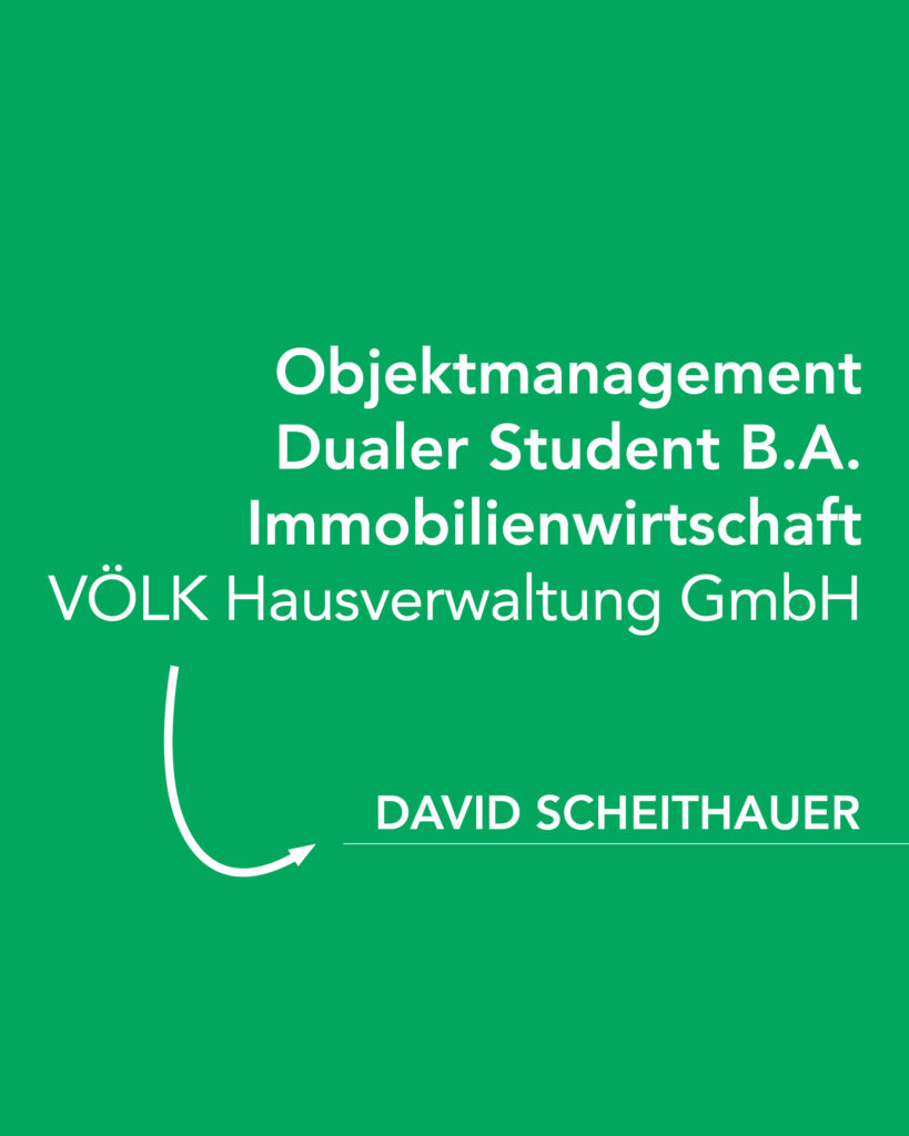 Im Rahmen seines dualen Studiums verbindet David theoretisches Wissen mit praktischer Erfahrung in der Immobilienverwaltung. Damit trägt er dazu bei, unsere hohen Qualitätsstandards in der Betreuung von Wohn- und Gewerbeimmobilien weiter auszubauen.